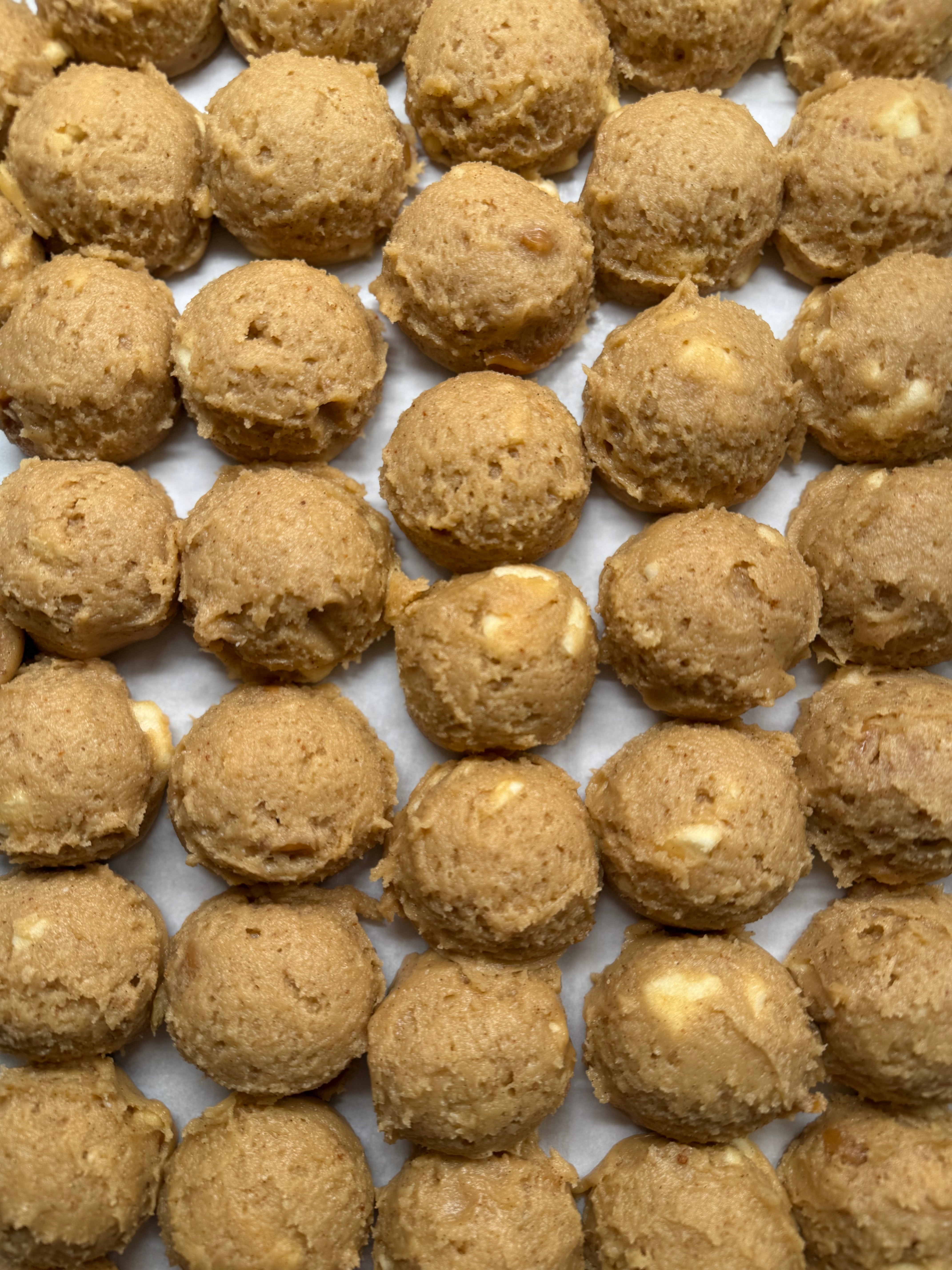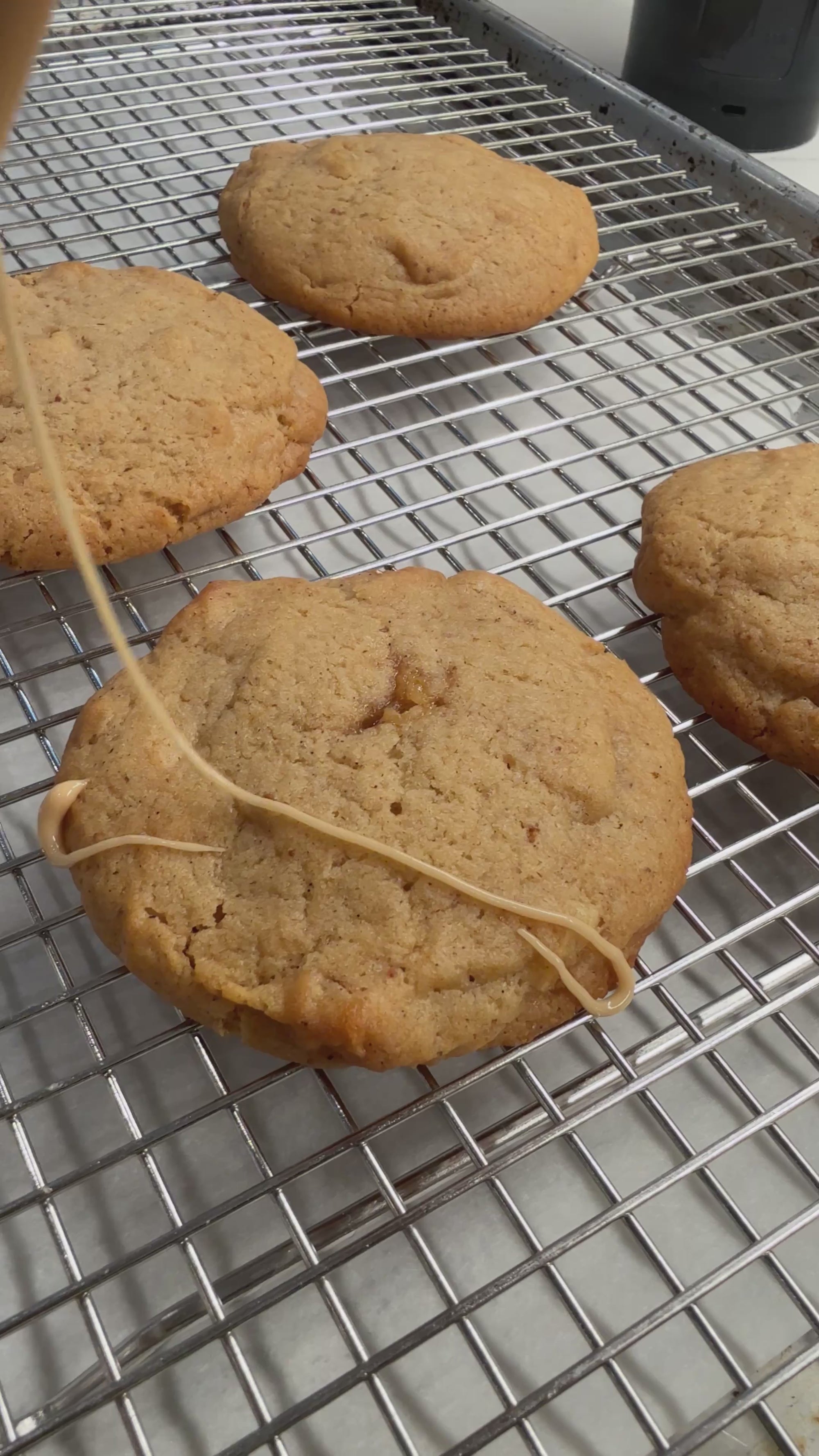 Our Caramel Apple Cookies taste like a trip to the orchard. Made with browned butter, boiled cider, and apple butter, then folded with real apple pieces and soft caramel bits. This fall classic is finished with a drizzle of apple cider glaze to really pack that apple punch. Sweet, buttery, and bright with apple tang. This one’s fall in every bite.